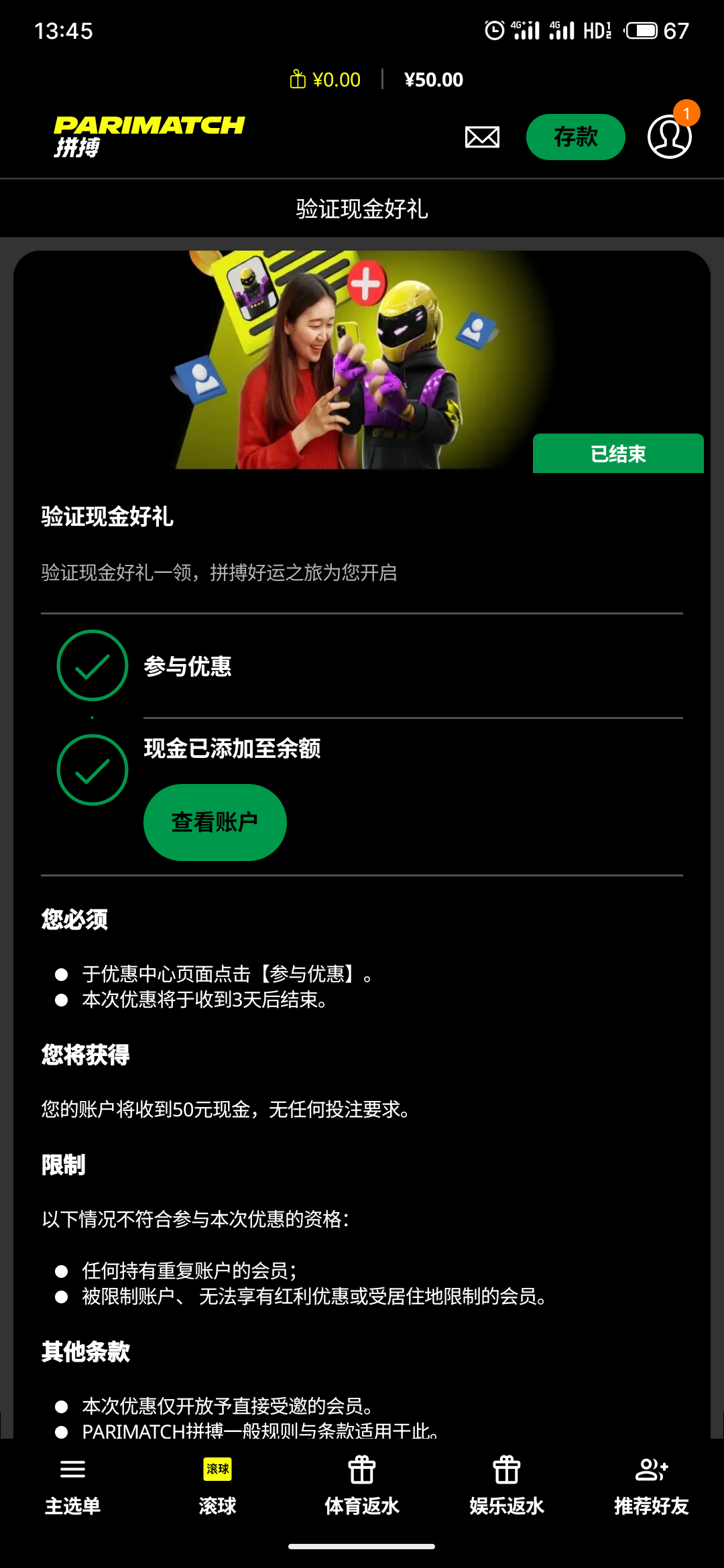 完成身份证认证,送50 1倍水