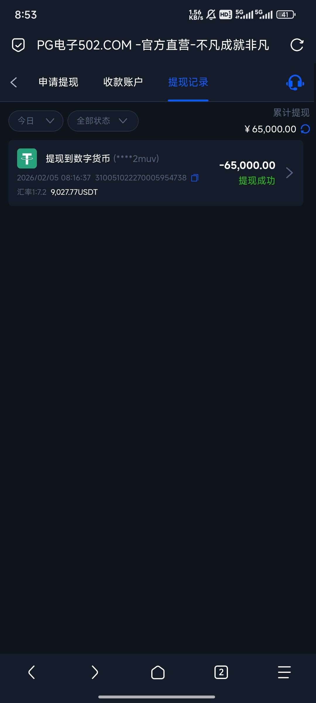 这个台我就上个月充过一次50u,今天上号看有两百多彩金我就去玩开20拉麻将,爆了两千多果断开100一拉,一共爆了1.7w,然后去玩真人下了几把对子跟和,中了4w多,本来这个时候我就想提现了,但是觉得它会黑我,就想着去电子刷点流水,谁知道又爆了,抱着提现被黑的心理,等了40多分钟居然给我出了,这个台昨天是不是有大哥输太多了,良心发现给我出了。