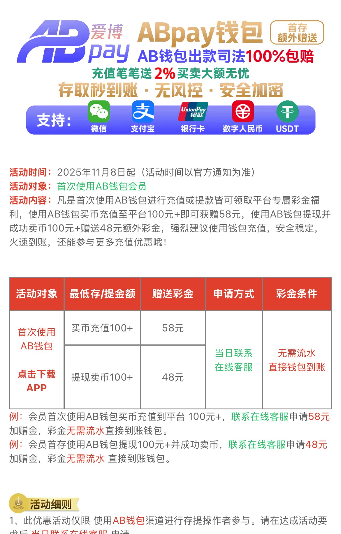 新人还可以撸一下AB钱包充值赠送彩金和提现赠送彩金(具体看图↓)