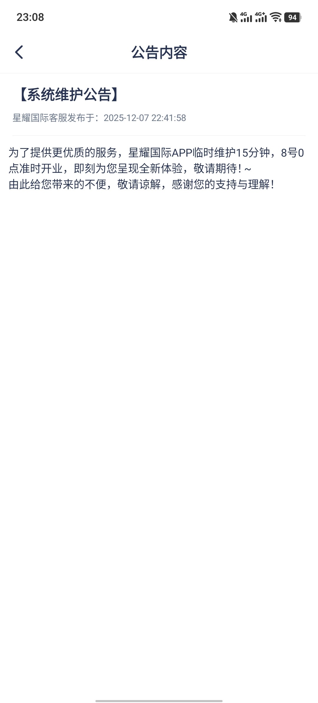 星耀国际开业时间12月08日0点不变,但为提升系统稳定性和访问速度APP需维护长1-2小时,维护期间APP将暂时无法登录,感谢您的理解与支持!加入星耀之时,您的星光事业也随之启航。