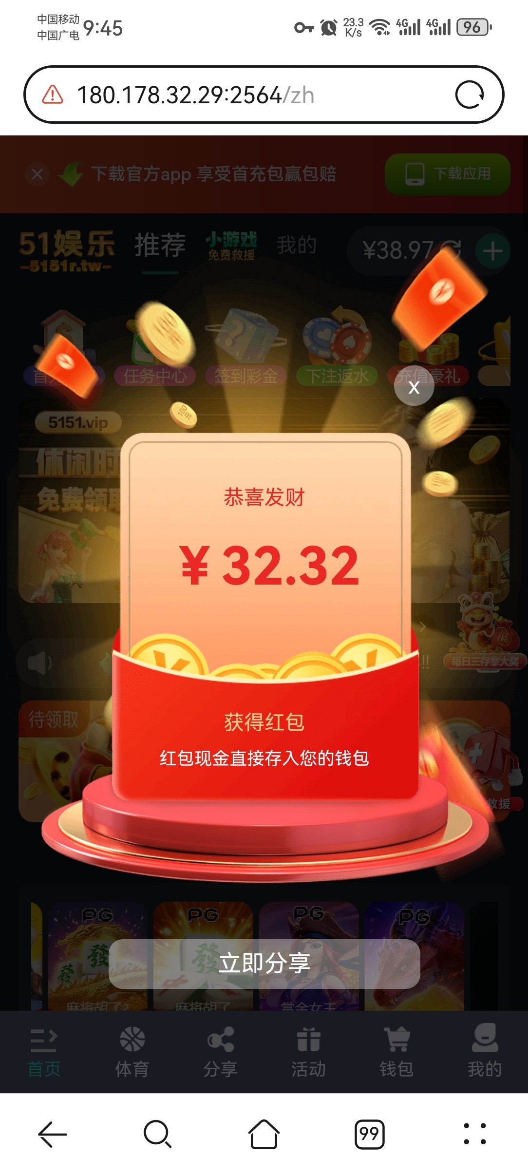 注册就送32,每天签到送2+,小游戏可以赚10几块,50才能进去pg,注册不用手机号,开vpn可以无限撸,我注册十几个,成功打下来一个