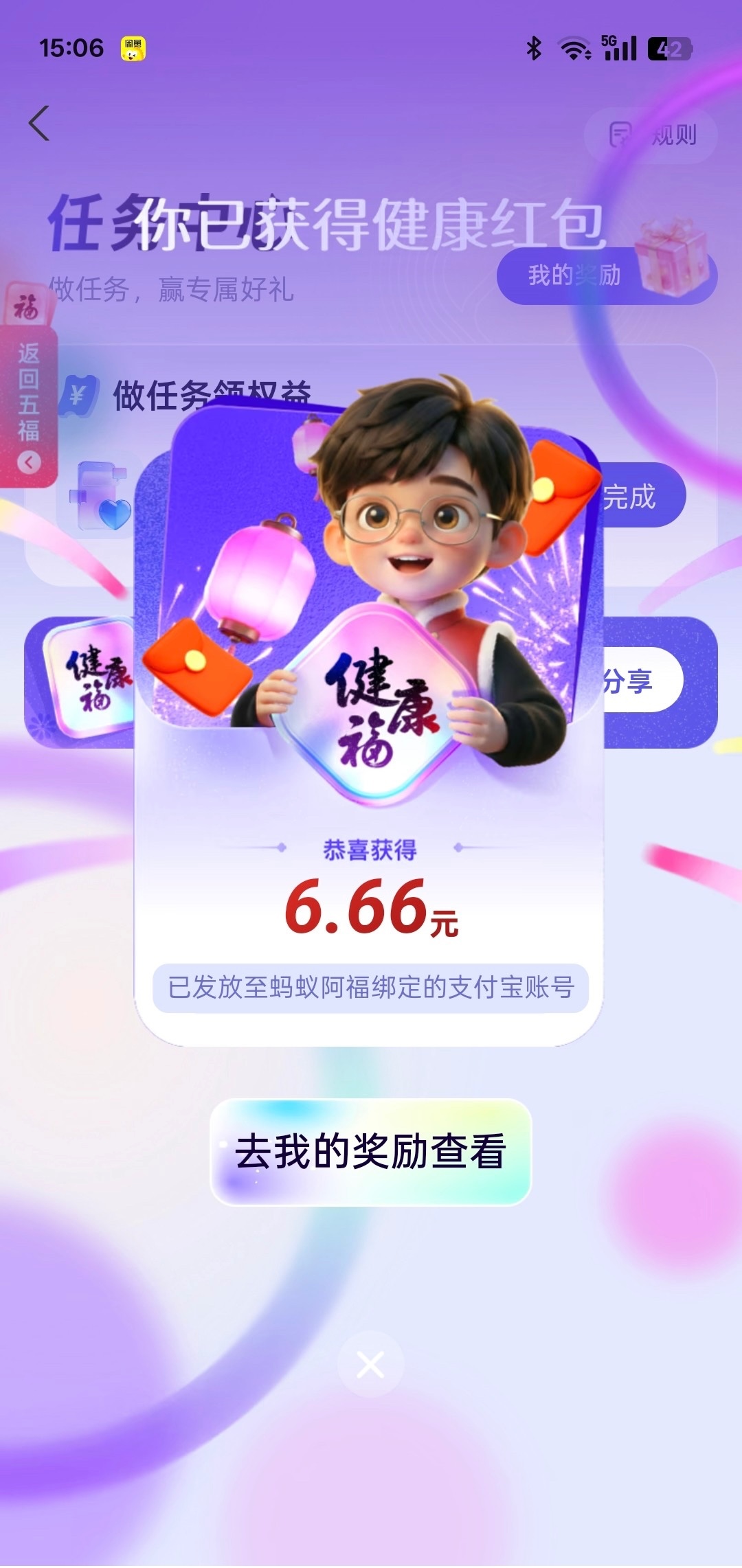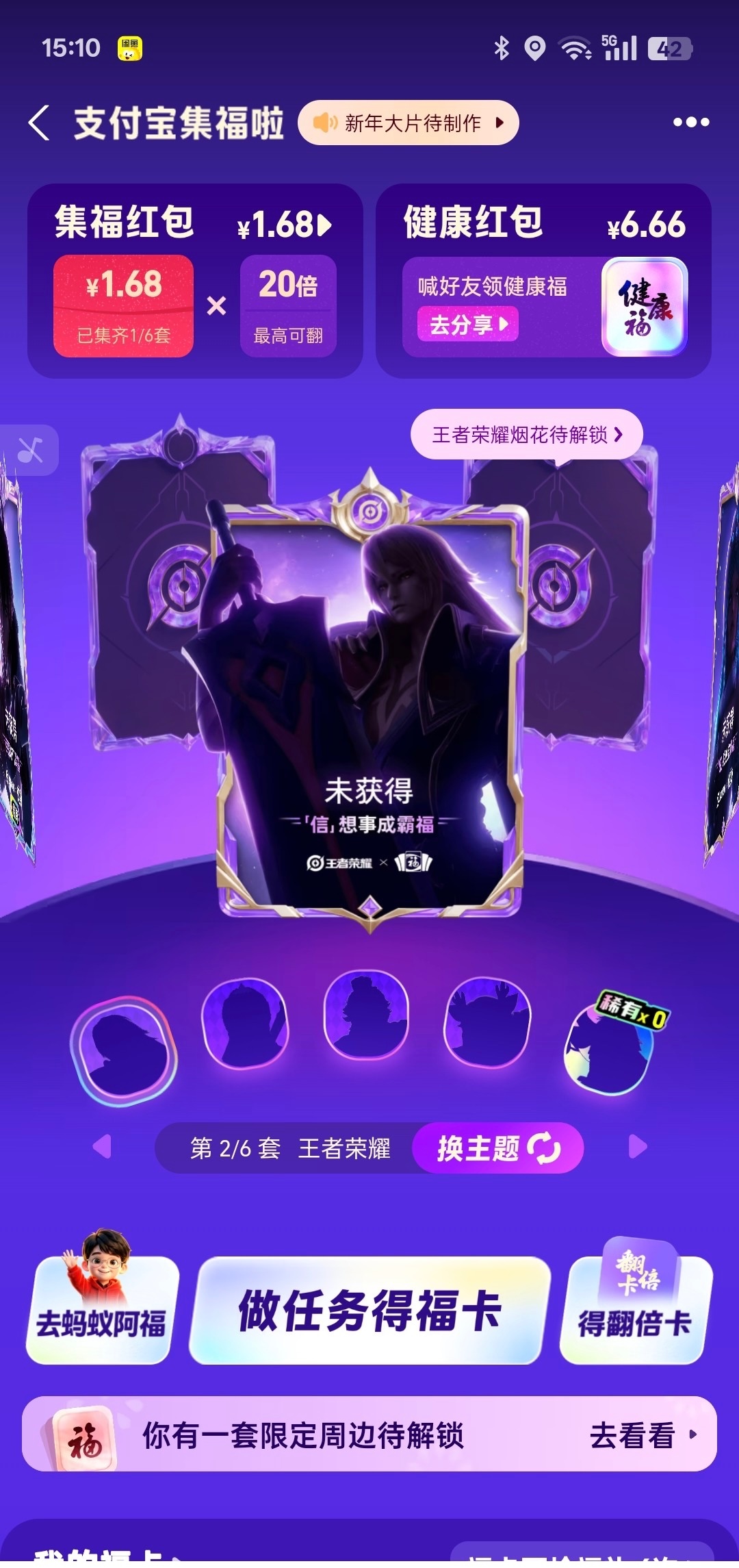 支付宝搜五福红包,随便点点就能集齐一套合成以后会跳出来下载阿福送16.66 下载蚂蚁阿福支付宝登录就可以基本就是一个牛子