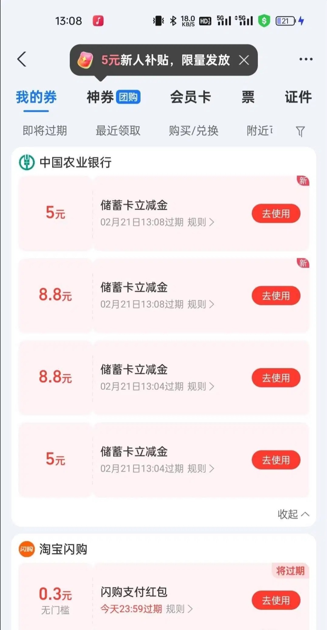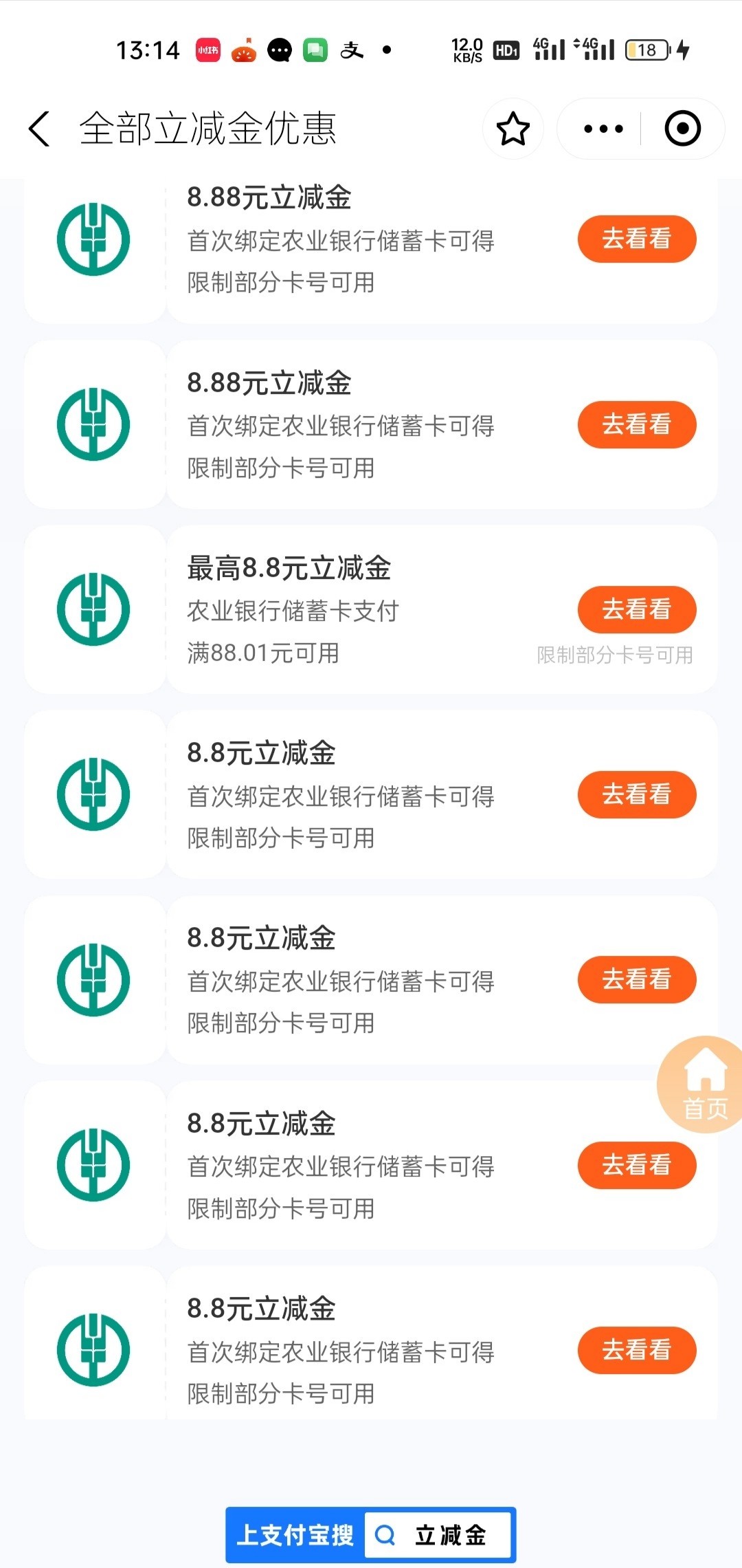 农业银行APP开二类户温州和台州地区8.8+5 *2  绑定支付宝 27块红包  赶紧去从最后两个开始试着绑定