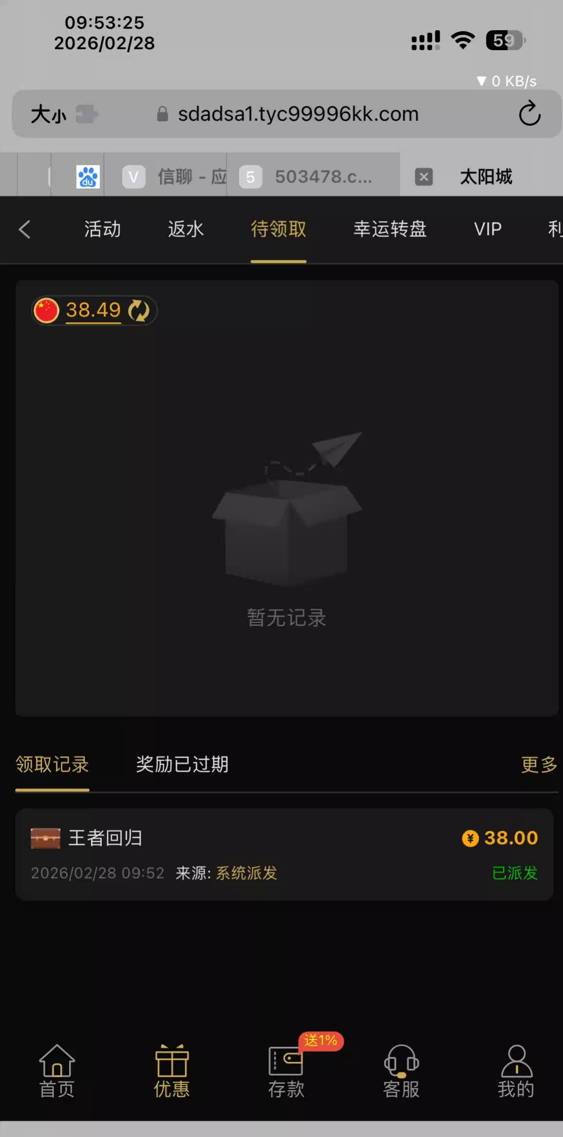 太阳城99996.com,电话回访彩金,电话刚打来的电话,vip1,没充值过,送了38,有号的老哥上号看看