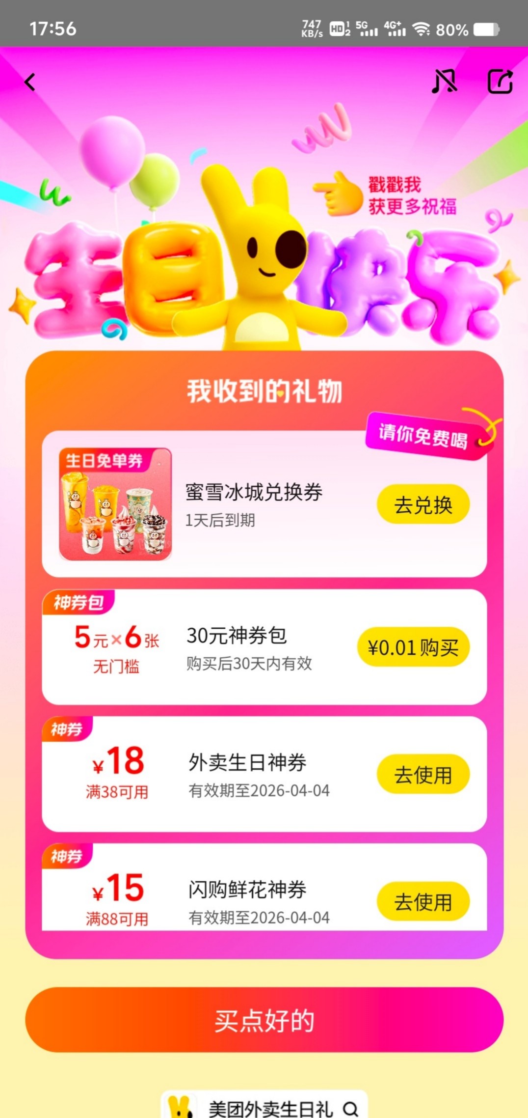 打开【美团】APP点我的头像,修改生日,日月修改成今天,主页点击外卖,下方有个生日快乐图标。点进去领取蜜雪冰城优惠券。